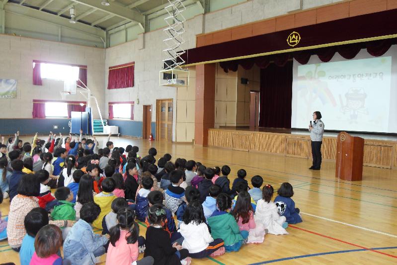 20일 오전 11시경 경주시 양남면에 위치한 나산초등학교 1~3학년과 유치원 130여명의 학생들을 대상으로 교통안전교육을 실시했다.