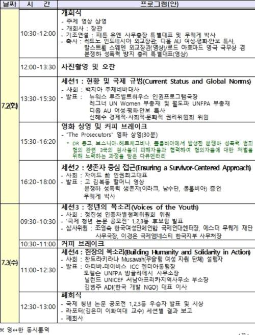 아울러 이번 회의에는 분쟁하 성폭력 생존자들의 생생한 경험 및 증언을 청취하고 ‘국제 청년 논문 공모전’을 통해 동 이슈 관련 미래세대들의 창의적인 목소리를 공유하는 순서도 예정되어있다.