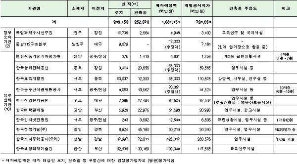 매각 대상 부동산은 총 19개로 정부 소속기관인 국립과학수사연구원과 중앙119구조본부 2개 기관, 정부 산하기관인 한국산업단지공단 등 10개 기관의 종전부동산과 매입공공기관 한국농어촌공사, 한국자산관리공사가 보유 중인 7개 부동산으로 구성되어 있다.