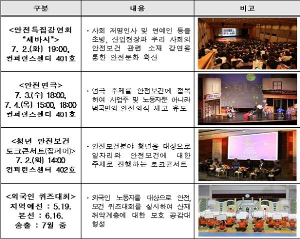 이날 기념식을 시작으로 7월 5일까지 5일간 서울 코엑스에서‘산업안전보건 강조 주간’행사가 이어지는데 “함께 지킬 안전, 모두가 누릴 권리”라는 주제 아래 산업재해 예방 유공자 포상, 국제 안전보건 전시회, 사고사망 절반 줄이기 등 최신 안전보건 쟁점 세미나, 산업재해 예방 우수 사례 발표, 다양한 국민 참여 행사가 개최된다.