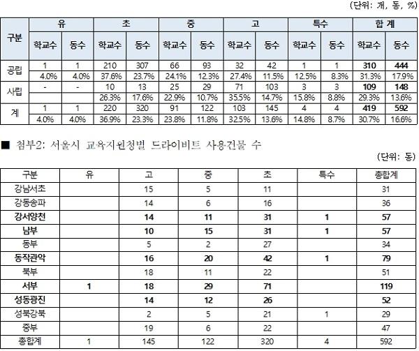 관할 교육청별로는 서울 서부교육지원청이 총 119개동의 학교건물이 드라이비트로 시공된 것으로 확인되었으며, 동작관악교육지원청 79동, 강서양천교육지원청, 남부교육지원청 각 57동, 성동광진교육지원청 52동으로 나타났다. 사부교육지원청의 경우 유독 드라이비트 건물이 많아 조속한 개선이 필요한 상황이다.