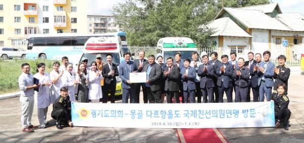 경기도의회 서형열 의원을 대표로 한 몽골 다르항올도 국제친선의원연맹 방문단이 1일 몽골 다르항올에서 ‘경기도 구급차 전달식’을 가졌다.