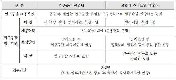 최장 5년까지 사용료 없이 입주 가능하도록 각 기업에서 무상으로 공실을 제공한다. ‘연구공간 공유제’의 경우 공실을 제공하는 기업에서 입주기업을 직접 선정하는 방식으로, 기업 간 상호 시너지가 기대된다. ‘M밸리 스타트업 하우스’는 서울시가 정책심의, 전문가 검토 등을 거쳐 입주기업을 선정하는 방식이다.