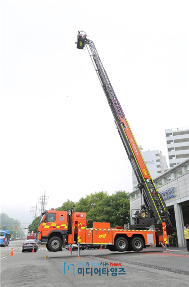 이번에 수성소방서에 배치되는 고가사다리차는 바스켓형 직진식 사다리차로써 최대 53미터까지 전개되어 17층 높이의 건물에 인명구조 및 화재진압이 가능하다.