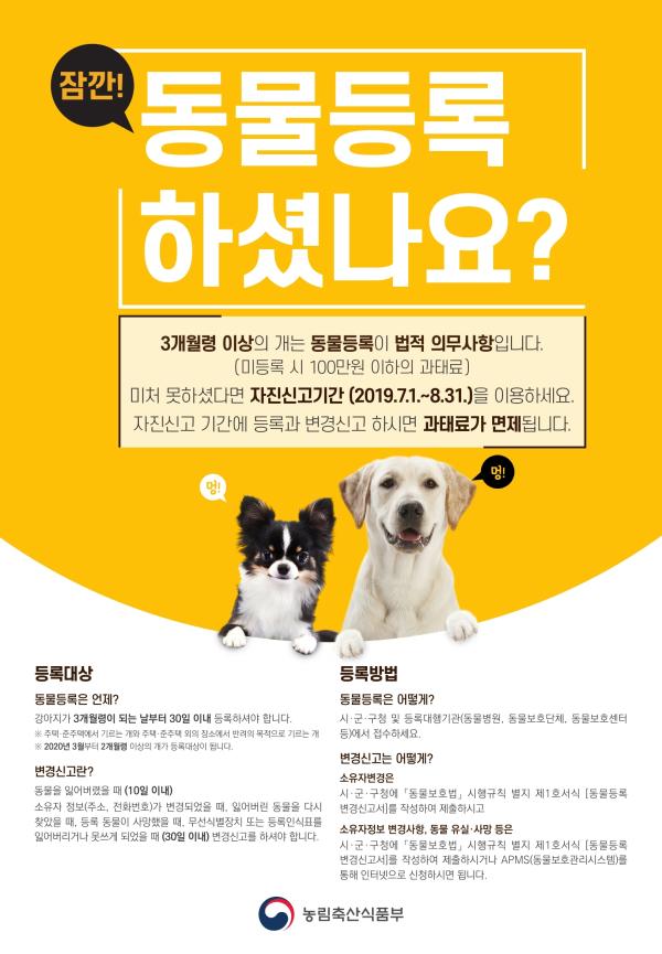 자진신고 기간 이후인 9월부터는 동물 미등록자와 동물 정보 변경 미신고자에 대해 과태료를 부과할 방침이다.