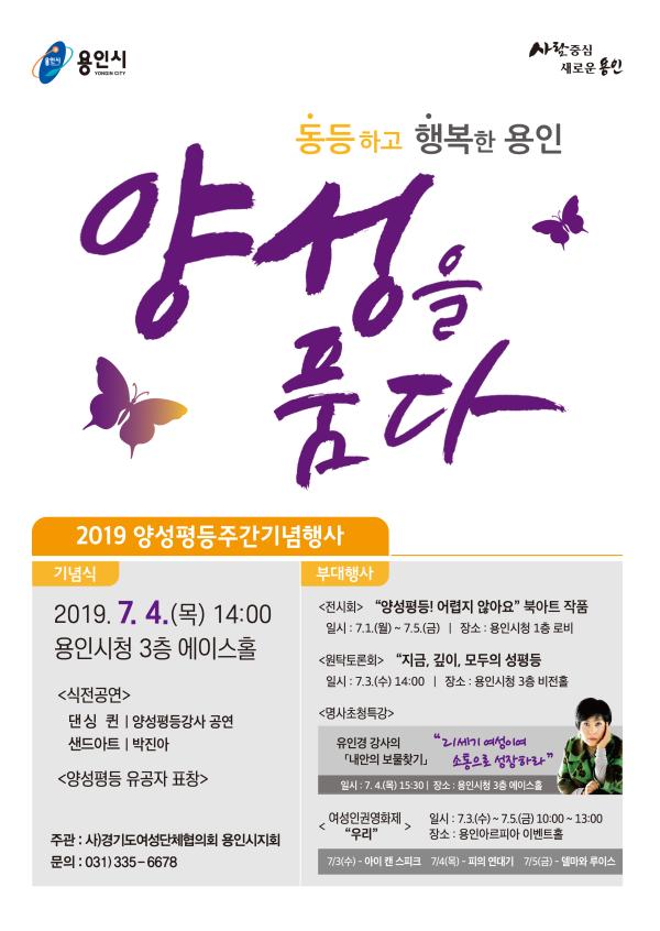 용인시는 지난 1일부터 오는 7일까지 양성평등주간 동안 ‘함께한 100년 함께할 100년 동등하고 행복한 용인’을 주제로 기념식과 전시회, 명사 초청 특강 등 다양한 기념행사를 마련한다.