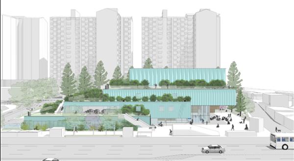 당선작은 건물 주출입구 앞에 광장과 각 층에 계단식 옥상정원을 조성해 지역주민들이 이용하는 시설로서 공공성을 확보하고자 했다. 주출입구 주변 외벽은 유리로 설치해 건물 내부 로비와 외부의 광장이 단절되지 않고 연계되는 공간이 될 수 있도록 제안했다.