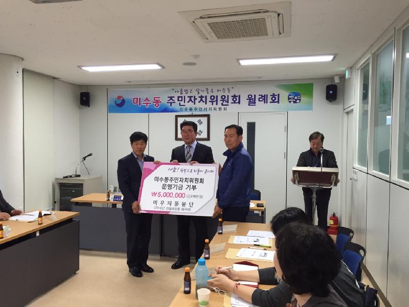 기탁한 성금은 미우지풍물단의 지난 당산제, 정월대보름, 달집태우기행사에서 미수동 일대 가정의 안택과 상가 번영을 비는 이웃사랑 실천을 위한 지신밟기 행사 개최로 모금된 협찬금으로 주민들의 작은 정성으로 마련됐다.