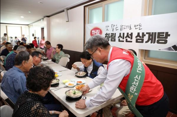 이날 행사에는 ㈜하림 박길연 대표이사와 임직원들로 구성된‘하림사랑 나눔실천단’40여명이 참여해 어르신들을 위해 삼계탕과 과일을 대접하며 안부를 묻는 시간을 가져 더욱 뜻깊은 행사가 됐다..