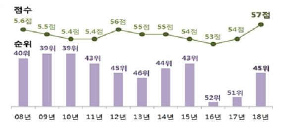 새정부 출범후 반부패정책협의회 구축·운영, 5개년 반부패 종합계획 수립·발표, 채용비리 근절 등 부패현안에 대한 적극적 대응 등 정부의 반부패 개혁의지와 노력으로 2018년 부패인식지수에서 역대 최고 점수를 얻어 6계단 상승, 45위를 기록했다. 또한, 공공기관의 청렴도도 2년 연속 상승하는 것으로 나타났다.