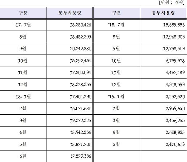 올해 1월부터 시행된 무상제공금지의 효과를 살펴보면, 2018년 1월부터 5월까지와 2019년 1월부터 5월까지의 사용량의 경우 9,066만 2,492장에서 1,478만 7,996장으로 7,587만 4,496장이 감소해 83.7% 이상 줄어든 것으로 확인됐다.