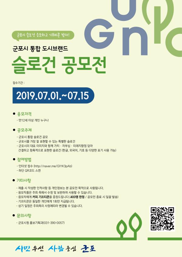 군포시가 통합 도시브랜드 슬로건 공모전을 진행, 오는 15일까지 응모작을 접수한다.