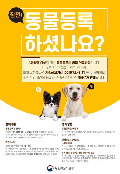 동물등록은 주택·준주택에서 기르는 개와 그외의 장소에서 반려의 목적으로 기르는 개를 대상으로 하며, 강아지가 3개월령이 되는 날부터 30일 이내 등록을 해야 한다. 미 등록시 100만원 이하의 과태료가 부과되고 동물의 유실, 사망, 소유자 정보변경 등의 신고를 하지 않은 소유자는 50만원 이하의 과태료가 부과된다. 단, 자진신고기간에 등록과 변경신고를 하면 과태료가 면제된다.