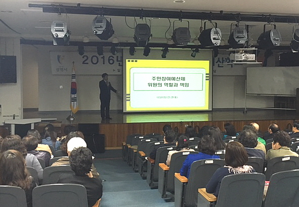 또 예산에 대한 전문성을 키우는데 주력하기 위해, 한경대학교 이원희 교수의‘주민참여예산제의 동향과 참여위원의 자세’에 대한 강의도 진행됐다.