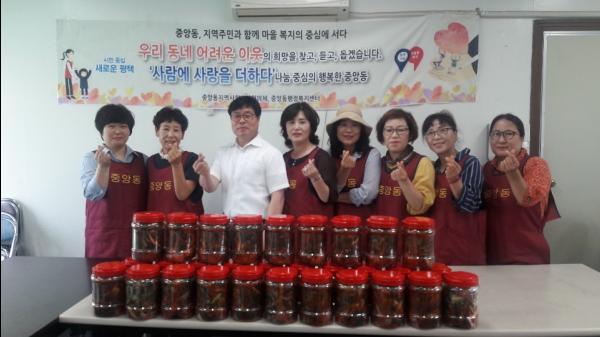 작년에 이어 중앙동 지역사회보장협의체가 특화사업으로 추진하는 ‘사계절 사랑愛 김치나눔사업’은 제철에 나는 신선한 재료와 지역사회보장협의체 위원들의 정성가득 손맛이 더해진 계절김치를 담가 생활이 어려운 홀몸어르신 가정에 직접 전달해 드리는 사업으로 지난 5월에도 열무김치를 담가 드렸다.