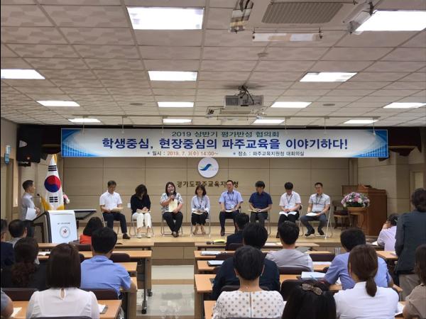 경기도파주교육지원청은 3일 100여명의 전직원이 참석한 가운데 ‘2019 상반기 사업 평가·반성회’로 “학생중심, 현장중심의 파주교육을 이야기하다’를 실시했다.
