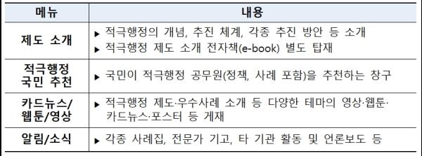 현직 래퍼가 참여한 적극행정 캠페인송, 적극행정 공무원의 인터뷰 영상, 축구를 소재로 적극행정을 소개하는 웹툰, 적극행정 우수사례 카드뉴스 등 다양한 시각형 홍보 콘텐츠도 게시되어 있다.
