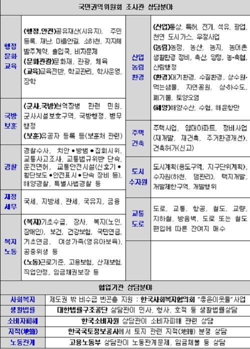 상담분야는 일반행정, 문화, 교육, 국방, 보훈, 노동, 산업, 농림, 환경, 도시계획, 교통, 도로, 세무, 주택, 건축, 경찰 등 모든 행정 분야이다.