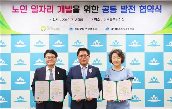 인천 미추홀구은 지난 2일 미추홀노인인력개발센터 및 인천보훈병원과 노인일자리 개발을 위한 공동발전 협약을 체결했다.