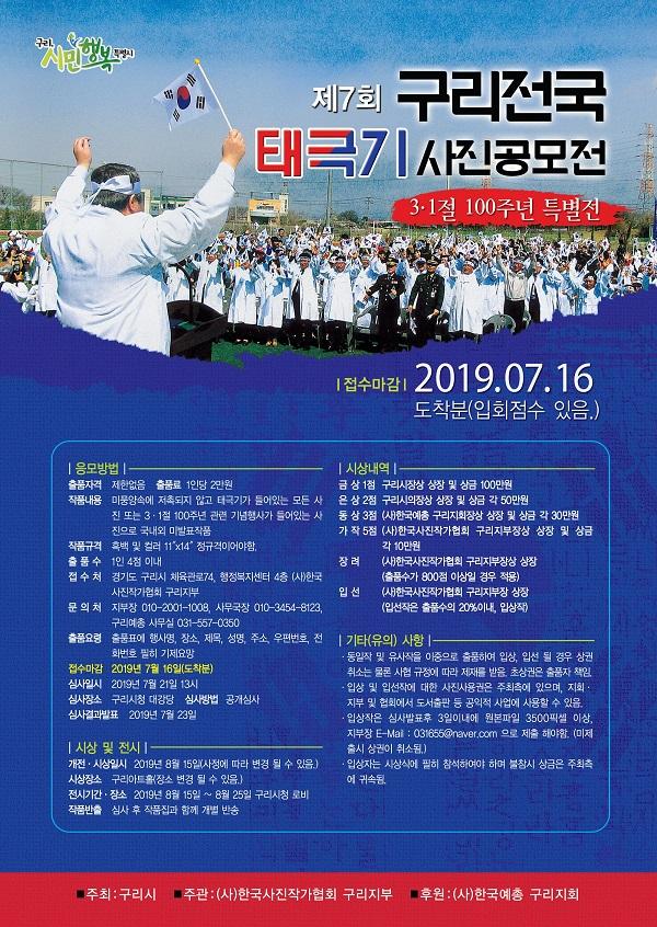 ‘구리전국 태극기사진 공모전’은 2013년 제1회를 시작으로 매년 개최해 올해 7회째를 맞이하고 있으며, 태극기를 사랑하는 마음을 사진으로 표현해, 나라에 대한 애정과 소중함을 함양하기 위해 시작된 사진 공모전이다.