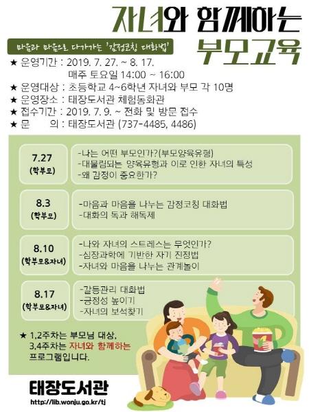 태장도서관이 오는 27일부터 8월 17일까지 2019년 부모교육 프로그램을 운영한다.