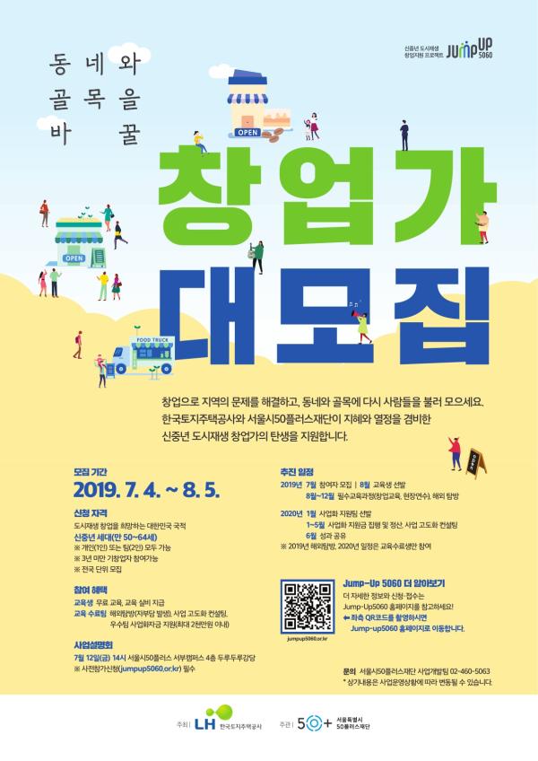 서울시50플러스재단이 한국주택토지공사와 함께 도시재생 창업아이템으로 창업을 희망하는 신중년 세대를 지원하기 위한 프로젝트 ‘JUMP-UP 5060’ 참가자를 4일부터 모집한다.