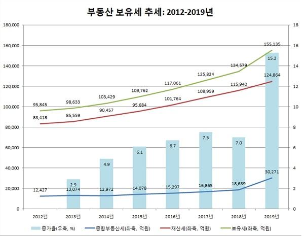 세부적으로 종합부동산세는 2018년 대비 1조1,1632억 원이 증가한 3조 271억 원으로 추정되며, 재산세는 8,924억 증가해 12조 4,864억 원에 달할 것으로 전망된다.