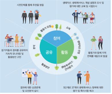 생태계서비스는 자연이 인간에게 제공하는 혜택을 말한다. 지역의 생태자산 발굴과 평가, 활용방안을 찾는 것이며, 인간과 자연이 공존하는 지속가능한 생태계를 유지하는 것이 목표다.