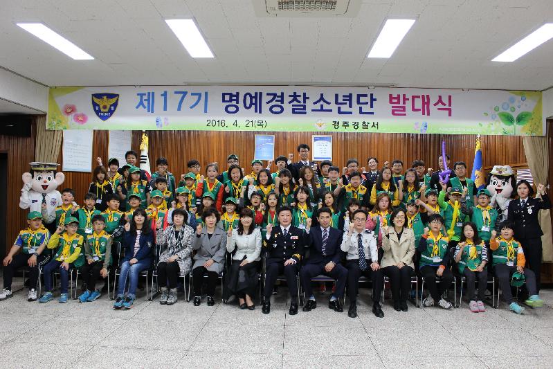 2016. 4. 21.(목) 16:00 경찰서 화랑마루에서 정흥남 경찰서장, 구종모 경주교육지원청 교육장, 명예경찰소년단, 지도교사 등 80여명이 참석한 가운데 “제17기 명예경찰소년단 발대식”을 가졌다. 제17기 명예경찰소년단은 경주초, 동천초, 용황초, 유림초, 금장초, 산대초 등 6개 초등학교에서 선발된 60명으로 구성 되었다. 이날 행사에서는 명예경찰소년단과 지도교사에게 위촉장과 기념품을 수여하고 학교폭력 예방교육과 마술공연, 경찰서견학 등 뜻 깊은 시간을 가졌다.