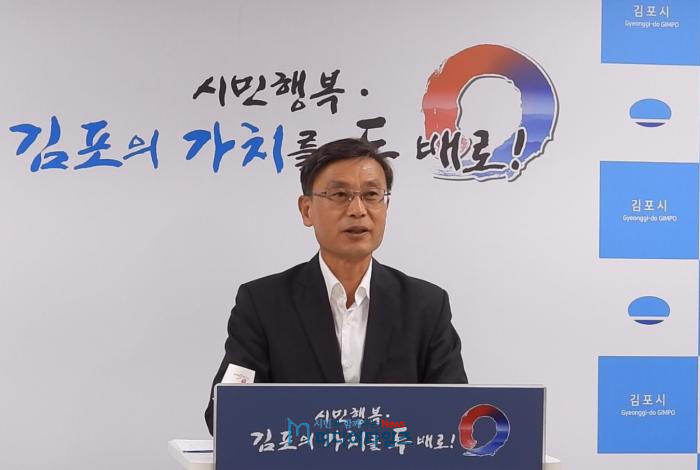 | 5일 오후, 정하영 시장이 긴급 기자회견을 열어 오는 27일 예정됐던 김포도시철도 개통 연기에 대해 기자들에게 설명하며 시민에게 사과하고 있다. |