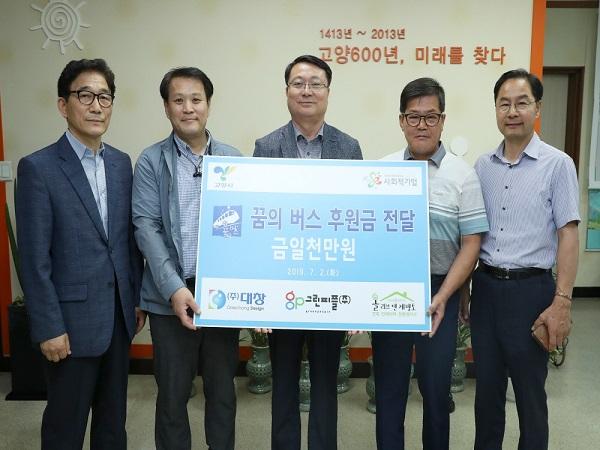 고양시는 지난 2일 고양시의 대표적인 사회적 기업인 ㈜대창, 그린피플㈜, ㈜올리브엔제펫토가 3년 연속 꿈의 버스 후원금을 전달했다고 밝혔다.