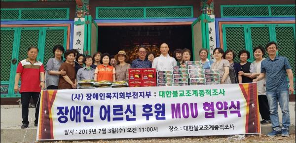 장애인복지회 부천지부는 지난 3일 대한불교조계종 적조사와 장애 어르신 후원을 위한 협약을 체결했다. 이 날 행사에는 후원 봉사자 20여 명이 함께했다.