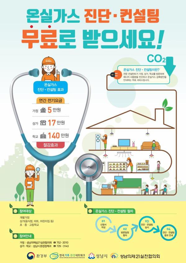 성남시는 온실가스 감축을 유도하려고 오는 9월 30일까지 가정, 상가, 학교 320개소를 대상으로 ‘온실가스 무료 진단 컨설팅 서비스’를 편다.