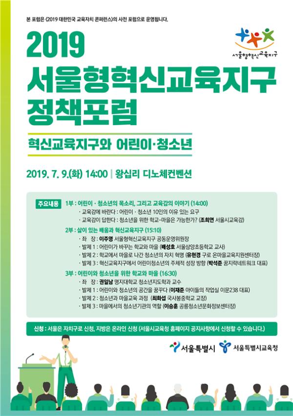 서울시교육청과 서울특별시는 오는 9일 오후 2시부터 ‘2019 서울형혁신교육지구 정책포럼’을 왕십리 디노체컨벤션에서 연다고 밝혔다. 정책포럼은 서울형혁신교육지구의 발전방향을 모색하기 위해 매년 개최되어 왔는데, 올해는 특히 2단계에 돌입한 서울형혁신교육지구에서 어린이·청소년을 자기 삶의 주인으로 세우기 위한 사회적 인프라와 컨텐츠 확산을 위한 논의가 본격적으로 진행된다.