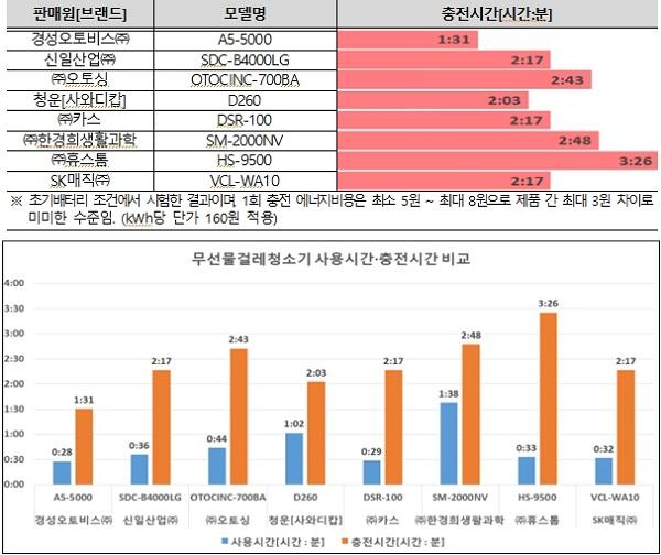 한경희생활과학(SM-2000NV) 제품의 사용시간이 1시간 38분으로 가장 길었고,경성오토비스(A5-5000), 카스(DSR-100) 2개 제품의 사용시간은 28~29분으로 상대적으로 짧았다.
