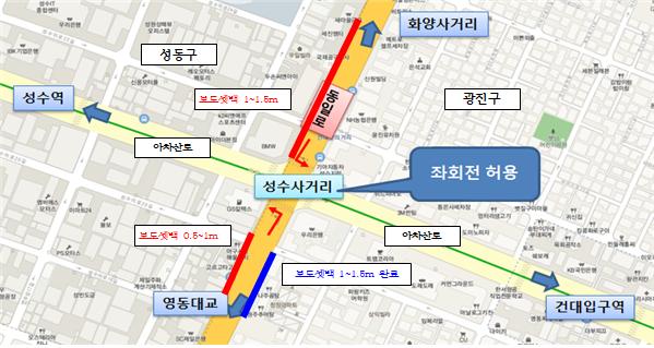 성수사거리 교차로는 그간 건대입구역 방향과 성수역 방향으로의 좌회전이 허용되지 않고 P턴만 허용되던 구간으로 P턴 차량들로 교차로 주변 교통체증이 가증되고 교통사고의 위험이 상시 내재되어 있던 구간으로 운전자들의 불편이 많아 지속으로 민원이 많았던 지역이다.
