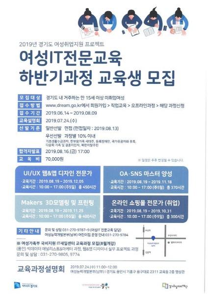한편, 경기도일자리재단은 8월 14일 여성능력개발본부 교육동에서 여성IT직업훈련과정에 대한 설명회를 개최할 계획이다.
