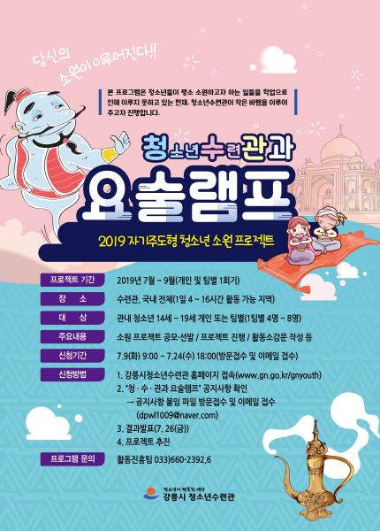 강릉시청소년수련관은 9일 접수를 시작으로 14세~19세 청소년들을 대상으로 자기주도형 소원 프로젝트 ‘2019 청소년수련관과 요술램프’를 추진한다.