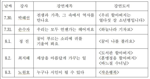 오는 30일 박혜선 강사의 ‘전쟁과 가족, 그 속에서 역사를 만나요’를 시작으로 8월 3일까지 매일 오전 10시, 총 5회에 걸쳐 진행된다.