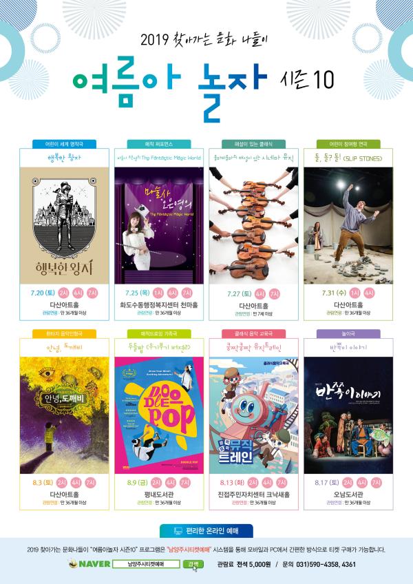 남양주시는 여름방학을 맞이해 2019 찾아가는문화나들이 ‘여름아 놀자 시즌10’을 다산아트홀을 시작으로 오는 20일부터 8월 17일까지 화도, 평내, 진접, 오남에서 개최한다.