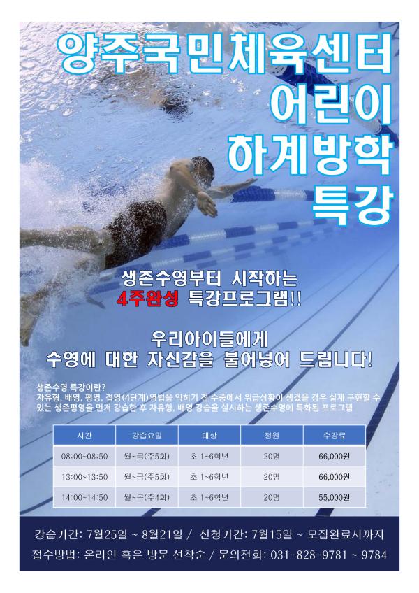 양주시시설관리공단에서 운영하는 양주국민체육센터에서 여름방학을 맞이해 어린이들에게 건강하고 건전한 여가생활을 위해 수영 특강을 개시한다고 밝혔다.