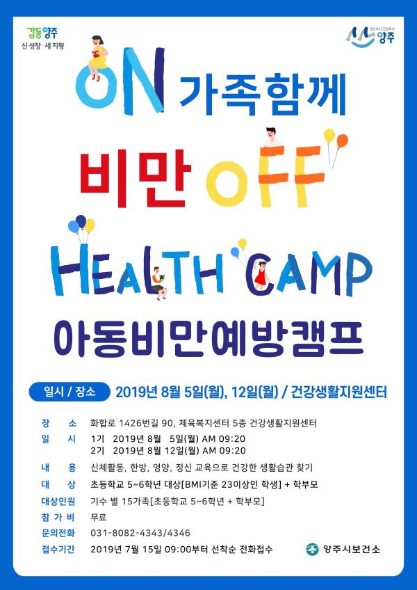 캠프는 양주시 건강생활지원센터에서 8월 5일과 12일 2기수로 운영하며, 참가대상은 관내 초등학생 5~6학년 중 BMI기준 23이상인 학생과 부모 등 가족이다.