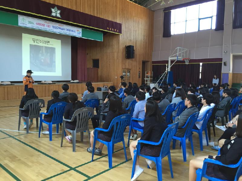 하청중학교의 수학여행 참여 학생과 인솔교사 전부에게 실시된 이날의 교육은, 최근 발생한 국내·외 사고발생 사례를 통한 예방 및 대처요령과 안전한 수학여행을 위한 단체행동 지침, 숙박시설의 소방시설의 이해 및 안저한 사용법, 안전사고 발생에 대처하는 응급처치요령, 심폐소생술 등을 교육했다.
