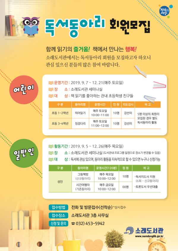 남동구 소래도서관은 ‘2019 서로 만드는 행복, 남동구’ 슬로건을 걸고 생활 속 독서문화 실천기회를 제공하기 위해 하반기 독서동아리 회원을 모집한다.