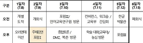 한국어 교육자는 한국어 교재 개발, 한국어 교수법 등을 논의하며, 교육 행정가는 한국어교육 현황 및 활성화 방안 마련을 위한 교육기관 방문 및 한국 역사·문화 체험을 진행한다.