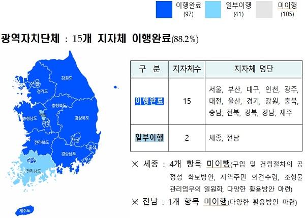 17개 광역자치단체 중에서는 서울특별시, 경기도 등 15개 지자체가 이행을 완료하고 세종특별자치시와 전라남도는 일부만 이행했다.