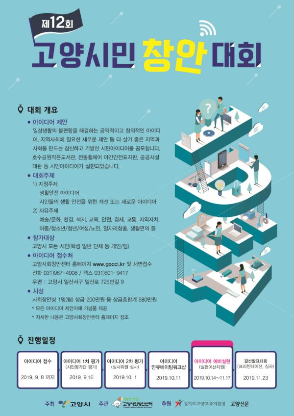 고양시는 일상에서 느끼는 소소하고 다양한 문제에 대해 시민들이 직접 해결방안을 내놓고 정책을 제안하는 ‘제12회 고양시민창안대회’를 개최하고 시민아이디어를 지난 8일부터 오는 9월 8일까지 공모한다.