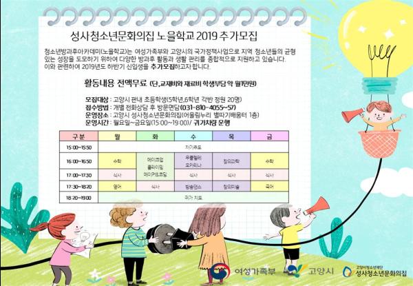 고양시청소년재단 성사청소년문화의집에서 초등 5,6학년을 대상으로 방과후아카데미 노을학교 참가 인원을 추가 모집한다.