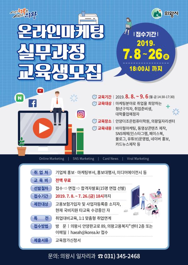 의왕시 일자리센터는 온라인마케팅에 관심 있는 청년들의 취업을 지원하기 위해‘온라인마케팅 실무과정’을 운영, 26일까지 교육생을 모집한다.