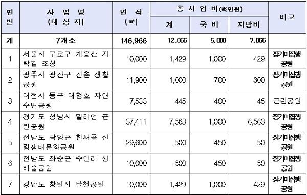 이번에 선정된 7개소 중 장기미집행공원은 6개소이며, 나머지 1개소는 수변공원으로 지역별로는 서울시 1개소, 광주시 1개소, 대전시 1개소, 경기도 1개소, 전남도 2개소, 경남도 1개소이며,